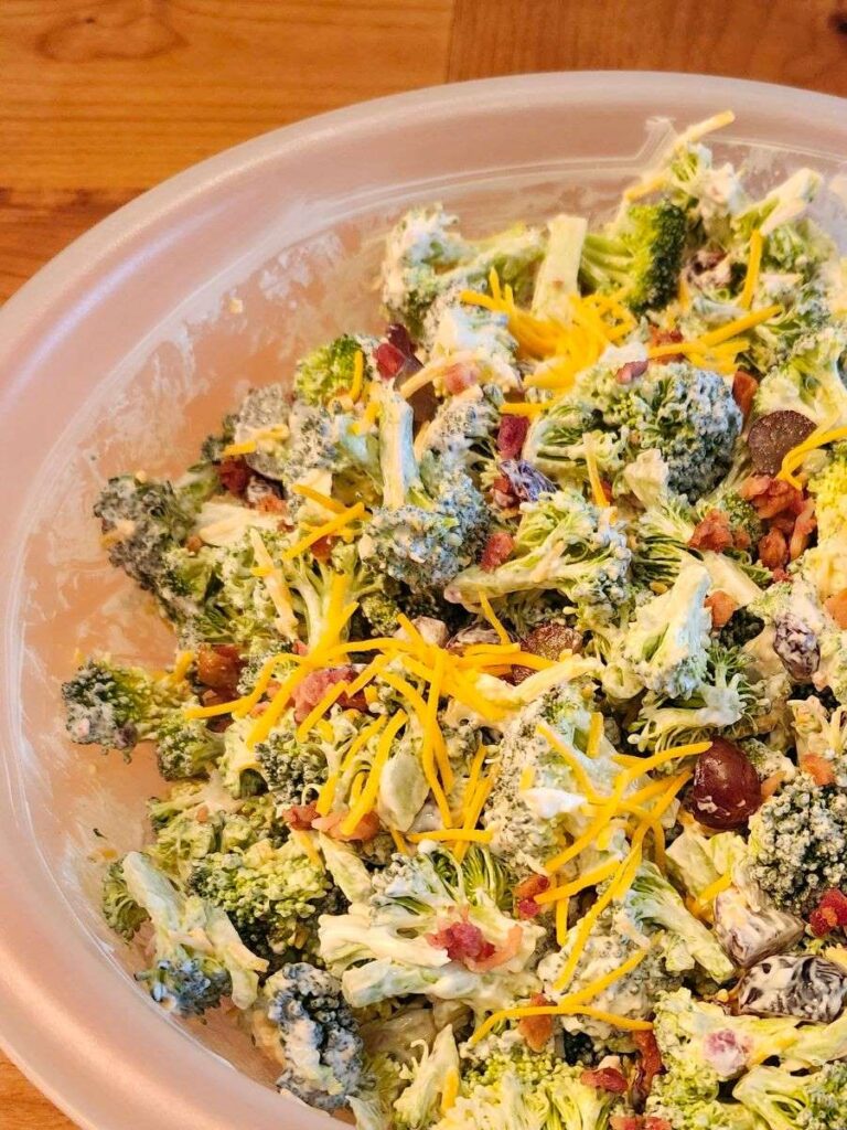 Hmmmm… Well it is a salad yes, however healthy maybe not. With that said, there are ways you can make this broccoli salad more of a healthy option. Make sure when are using bacon you do not use the imitation bacon. I like to use the pre-cooked bacon from Sams club; however, you can always cook it yourself as well.