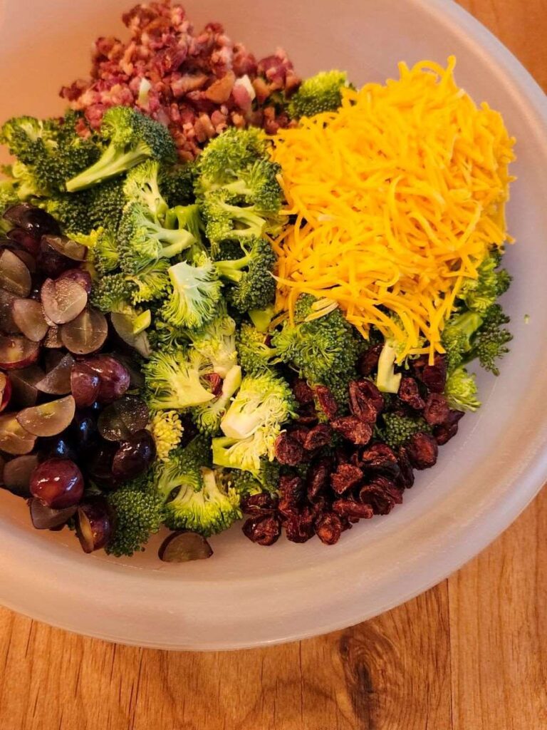 - Combine broccoli florets, sharp cheddar cheese, cranberries, red grapes, and bacon in a large bowl.